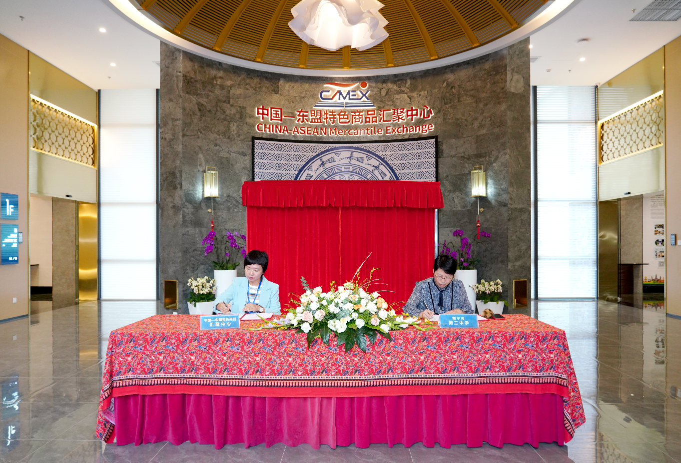 2023年10月10日,匯聚中心又吸引了南寧市第二中學(xué)、南寧市新民中學(xué)學(xué)生綜合實(shí)踐研學(xué)基地落戶(hù),并圓滿(mǎn)舉辦了簽約和揭牌儀式。南寧市第二中學(xué)校區副校長(cháng)曾晶、南寧市新民中學(xué)副校長(cháng)關(guān)雪、中國—東盟特色商品匯聚中心副總經(jīng)理盧春梅、中國—東盟特色商品匯聚中心副總經(jīng)理李丹共同出席儀式。